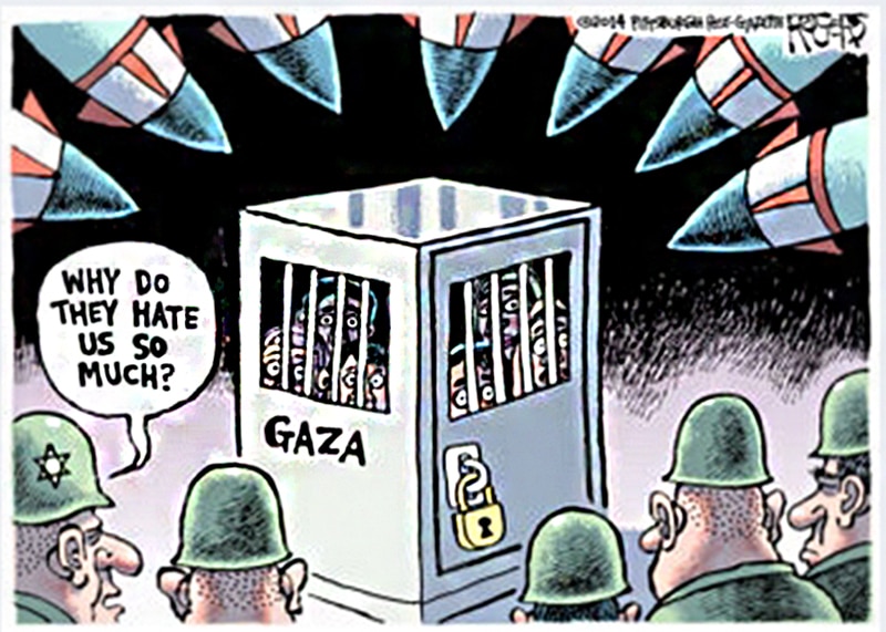 Doris’ ordeal was similar to the one cartoonist Rob Rogers suffered ten years ago. Rogers drew Palestinians huddled in a tiny prison, beset on all sides by missiles and Israeli soldiers. “Why do they hate us so much?” one trooper muses (Pittsburgh Post-Gazette, 8/7/14).