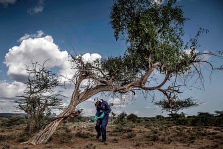 A person sprays pesticides in an area infested with hopper bands of desert locust next to Lokichar, Turkana county, in Kenya, in 2020. Photograph: Luis Tato/FAO/AFP/Getty Images